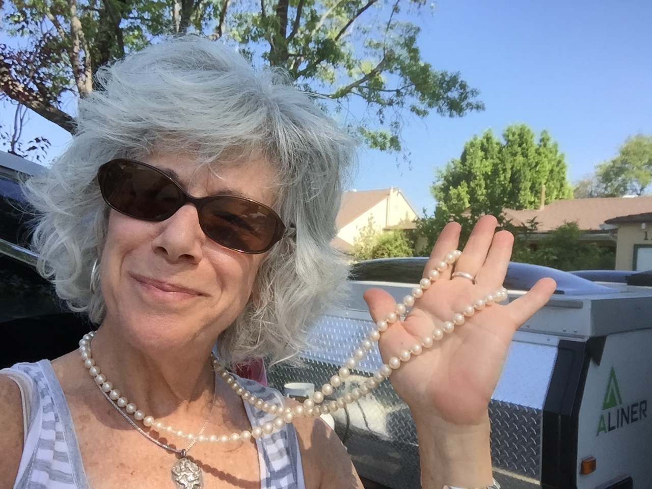 Margery (Jenny and Nowell’s 89 year old neighbor) came to say good-bye, just as I was getting ready to pull out.  “Here” she said, draping a necklace around my neck. “I want you to have my pearls. Have a safe trip!” Now glamping in true style.